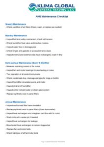 The Klima Global AHU Maintenance Checklist is a region-specific guide designed for HVAC professionals and facility managers across the UAE and GCC. It outlines essential weekly, monthly, semi-annual, and annual maintenance tasks to ensure optimal performance, energy efficiency, and indoor air quality for Air Handling Units (AHUs) in demanding Gulf environments.